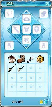 上端显示已经装备到角色的装备品情况,下端显示现在持有的各种装备和道具以及金币(货币单位)的情况。