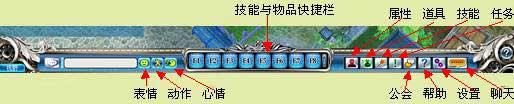 5.系统菜单:从左到右分别是 属性 道具 技能 任务 公会 帮助 设置