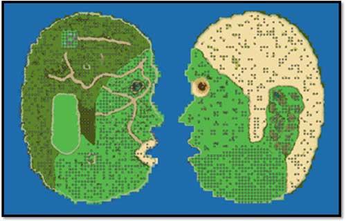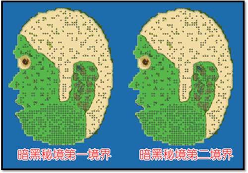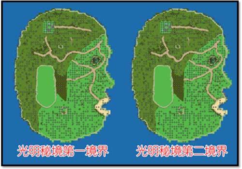 1、 分为光明秘境和暗黑秘境,玩家在白天只能进入光明秘境、晚上只能进入暗黑秘境。两张地图从俯视看分别为一张严肃的脸(光明秘境)和一张奸笑的脸(暗黑秘境),两张地图的地形、植被、建筑的风格也完全不同。
