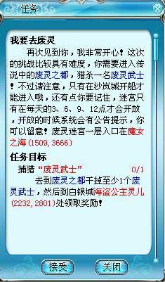 相关任务流程:携带该证至新增NPC“海盗公主灵儿”处接取任务“我要去废灵”。任务要求到废灵内打一个怪物:“废灵武士”就完成任务)回“海盗公主灵儿”处交还任务“我要去废灵”,获得特制努力增幅器一个,特制财富增幅器一个