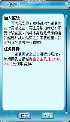 相关任务指引:引导玩家携带该证至新增NPC“海盗公主灵儿”处接取任务“加入混战”,要求玩家在酒吧PK完成十场比赛,无论输赢,完成任务,玩家可以获得金币3W,特制组队经验果一个
