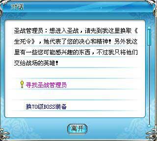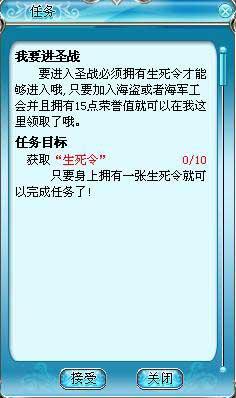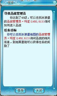 相关任务流程:玩家携带“圣战引导图”至新增NPC“海盗公主灵儿”处接取任务“寻找圣战管理员”,玩家通过任务的提示找到冰狼堡的NPC圣战管理员玛亚(1450,612),完成任务。与NPC圣战管理员玛亚(1450,612)对话获取我要进圣战任务,玩家查询相关圣战内容后完成任务,获得金币5W,特制组队经验果5个