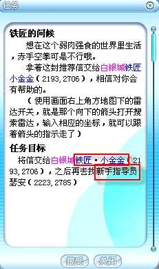 4、 针对当前任务系统做更改,所有相关的接受任务坐标、任务需要杀的怪物坐标、任务需要去寻找的NPC坐标、完成任务的NPC坐标都以红色字显示(任务中提到两次的,只在第一次写坐标)并且这些红色显示的NPC或怪物坐标可用鼠标左键点击,启动智能寻路系统。