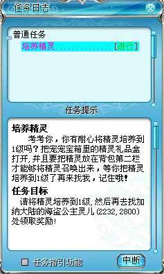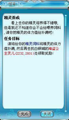 你可以通过宝箱开出的精灵养成须知至NPC海盗公主灵儿(2231,2800)处接培养精灵任务,任务要求:将精灵养成到1级,并且将精灵放在背包第二格才能够完成任务,任务奖励:等级提升一级(30级以上无法提升),金币4000