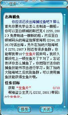 相关任务流程:捕鱼任务介绍至新增NPC“海盗公主灵儿”处接取任务“出海捕鱼”,任务要求:在白银城码头外加纳大陆海域“2270,2907”附近寻找鱼群,获取“生鱼片”10个。然后回“海盗公主灵儿”处交还任务,获得任务奖励:等级提升一级,金钱10000