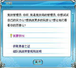 相关任务流程:任务物品“PK指引证”,玩家携带该证至至新增NPC“海盗公主灵儿”处接取任务“我要学PK”,任务要求:玩家至白银城酒吧PK引导员处领取“勇者之证”,进入酒吧PK一次。无论输赢,只要读取到“勇者之证”战斗次数为一次,则任务完成,任务给予“海盗PK学成书”一本以及荣誉加点书一本。玩家携带“海盗PK学成书”回“海盗公主灵儿”处交任务“我要学PK”,获得金钱1万