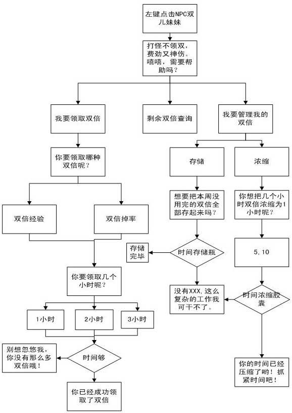 2) 浓缩双倍时间,先要购买一个”时间浓缩胶囊”放在背包里,然后在NPC双儿妹妹处点选”浓缩时间”.选择浓缩的时间后,扣除该玩家在系统中对应的双倍时间,浓缩为1小时的多倍经验.浓缩成功后时间浓缩胶囊消失.浓缩5小时获得1小时的4倍经验,浓缩10小时获得1小时的7倍经验。